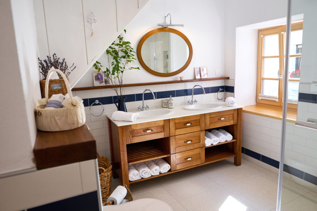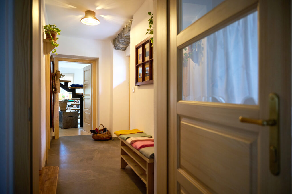 Bivalni prostori hiše so svetli in namenjeni skupnemu bivanju. Kuhinja, srce doma, vabi k pripravi obrokov in dolgim pogovorom ob mizi, dnevna soba pa ponuja umirjen prostor za počitek, branje ali večere ob kaminu. Kopalnica ohranja avtentično prvotno razporeditev hiše, ki smo jo premišljeno prilagodili sodobni rabi, ob tem pa ohranili značaj in občutek zgodovine prostora.