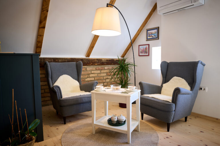 Svetla in prostorna mansardna soba z vidnimi lesenimi tramovi, ki ustvarjajo toplino in domačnost. V središču je udobna zakonska postelja z nežno osvetlitvijo, ob njej pa kotiček z dvema foteljema za branje ali sprostitev. Naravni materiali, umirjeni toni in klima zagotavljajo prijetno bivanje v vseh letnih časih.
