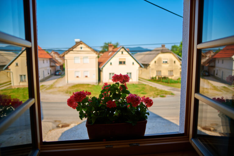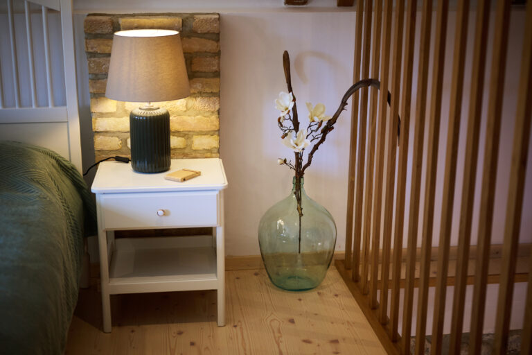 Odprta in prijetna soba z velikim oknom, ki prostor napolni z naravno svetlobo. Udobna zakonska postelja, mehke zavese in skrbno izbrani detajli ustvarjajo občutek miru in domačnosti. Poseben čar daje t.i. gašperček, jugoslovanska litoželezno peč, ki prostoru doda toplino in značaj, hkrati pa se soba harmonično povezuje s sodobnim udobjem.