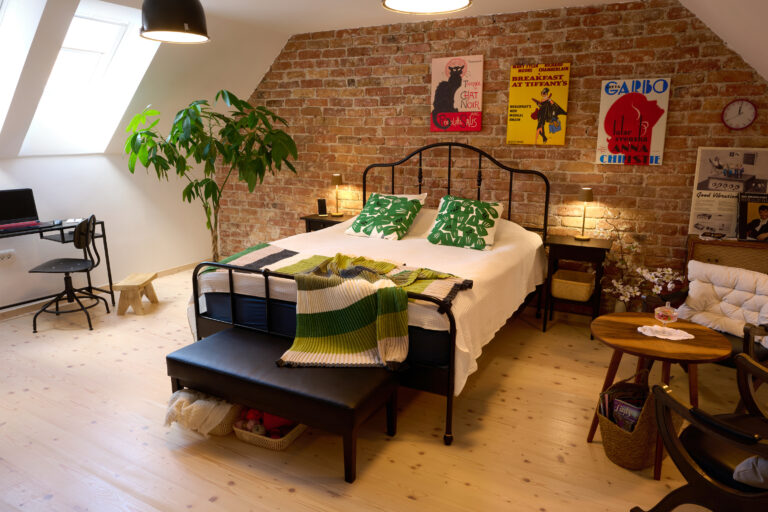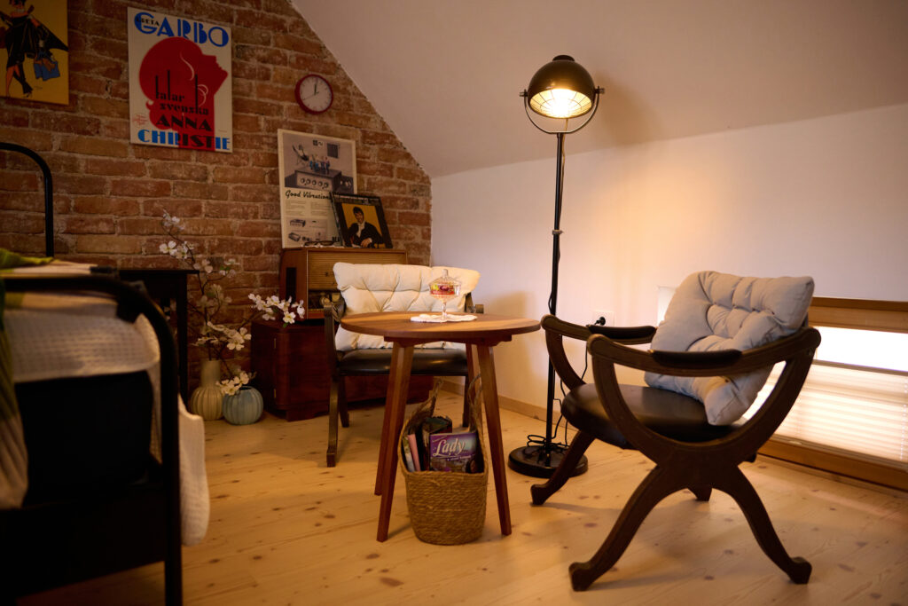 Prostorna mansardna soba z izrazito opečnato steno, ki prostoru daje značaj in toplino. Udobna zakonska postelja, skrbno izbrani retro detajli in kotiček za sedenje ustvarjajo prijetno, nekoliko igrivo vzdušje. Naravna svetloba in umirjena osvetlitev poskrbita za sproščeno bivanje z občutkom doma.